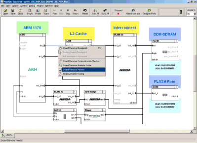 In some cases you may have access to an "SoC" (or "ESL") simulator. This tool allows users to connect various component models (e.g., models of a processor core, cache controller, and buses) to form a cycle-accurate simulator for the whole chip. Figure 2 shows a screen shot of an SoC simulator for the ARM1176.